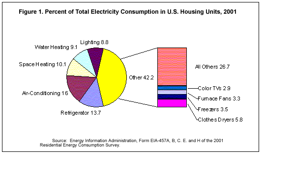 Electricity is consumed for a wide variety of uses in the home. This web product presents a detailed account of the amount of electricity used to operate numerous appliances in 2001.