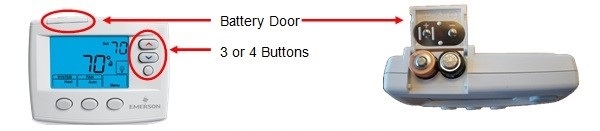 The potentially affected thermostats have a battery door on top and either 3 or 4 buttons to the right of the blue screen.